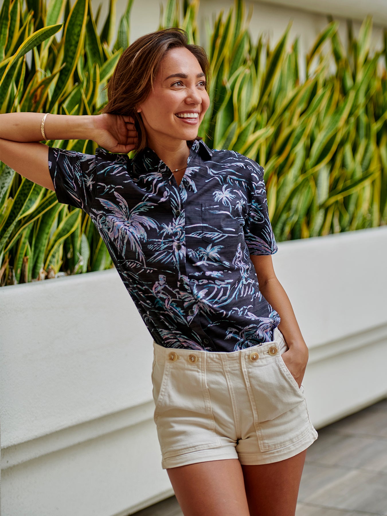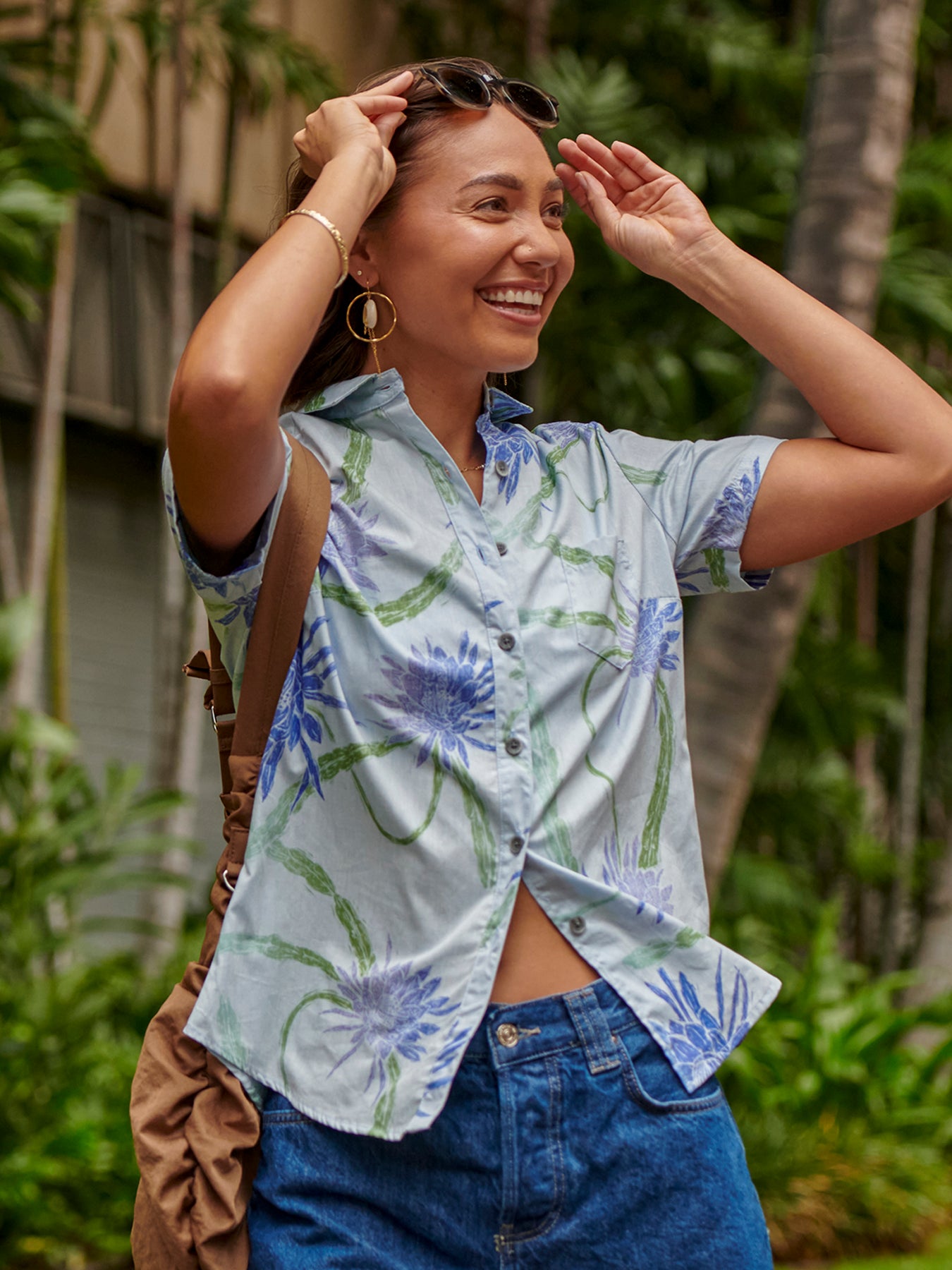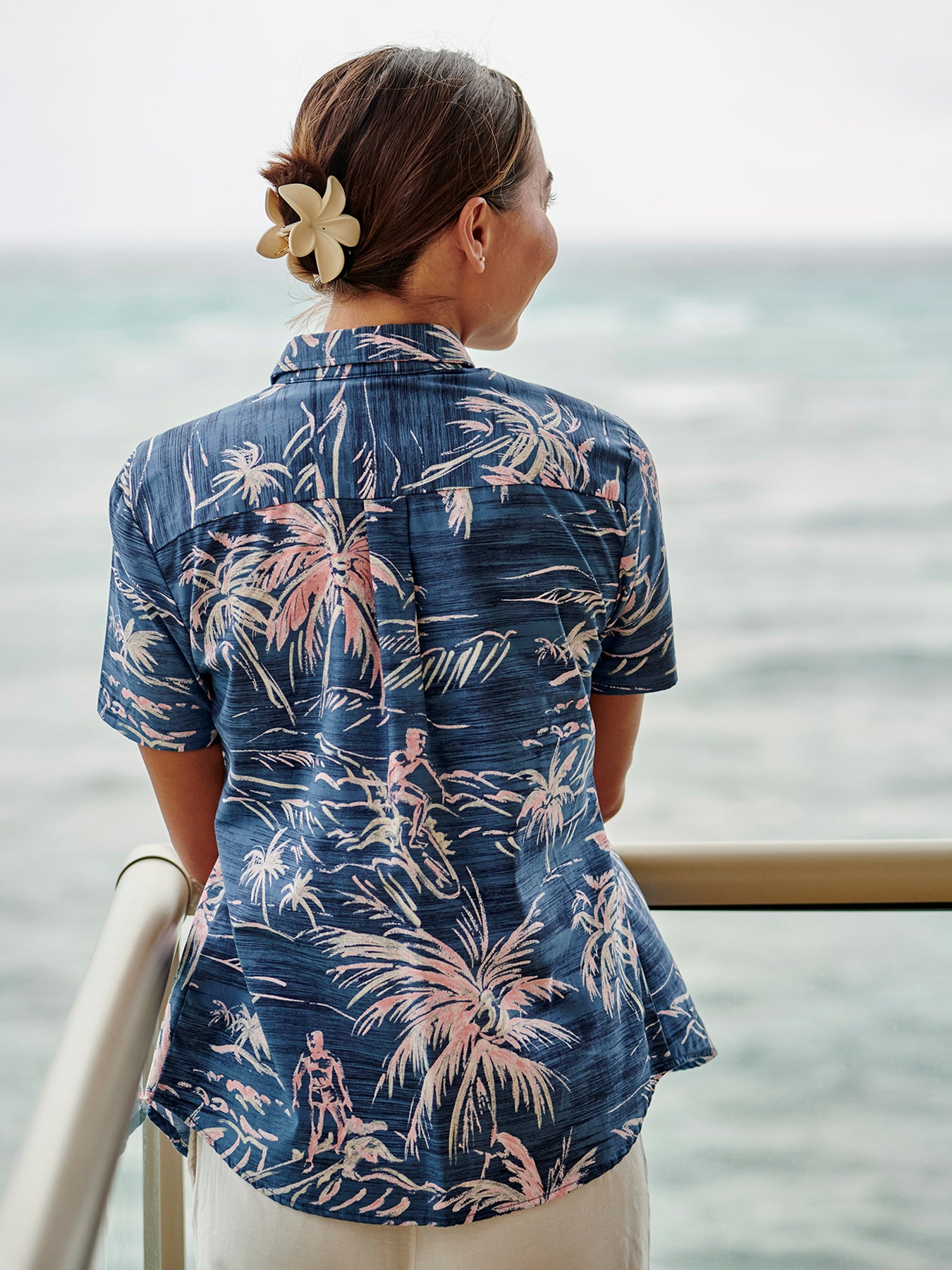 Inspirándonos en nuestros icónicos "silkies" de la década de 1930, nos asociamos con las mismas fábricas de telas japonesas que produjeron nuestros originales para crear un filamento de rayón exclusivo, que luego cortamos y cosimos en Hawai'i. Con técnicas de impresión mejoradas, nuestros estilos de cuello estilo campestre tienen el aspecto moderno y relajado del original, pero con una sensación de suavidad actualizada.