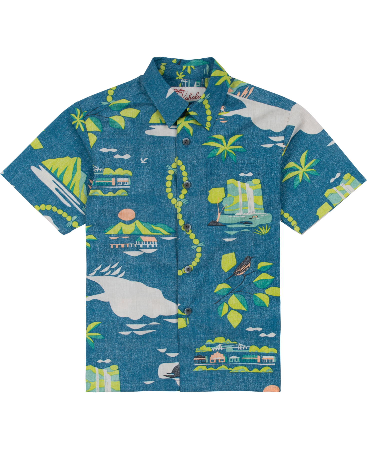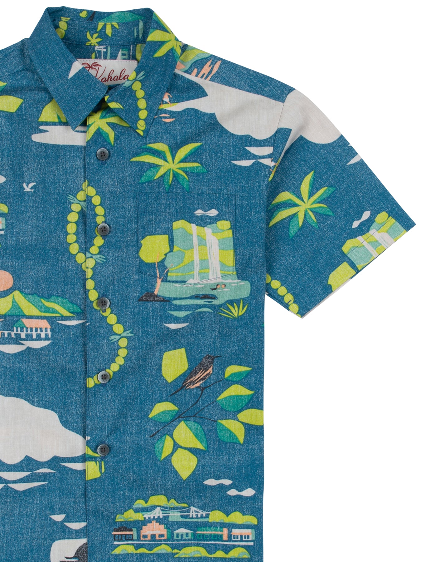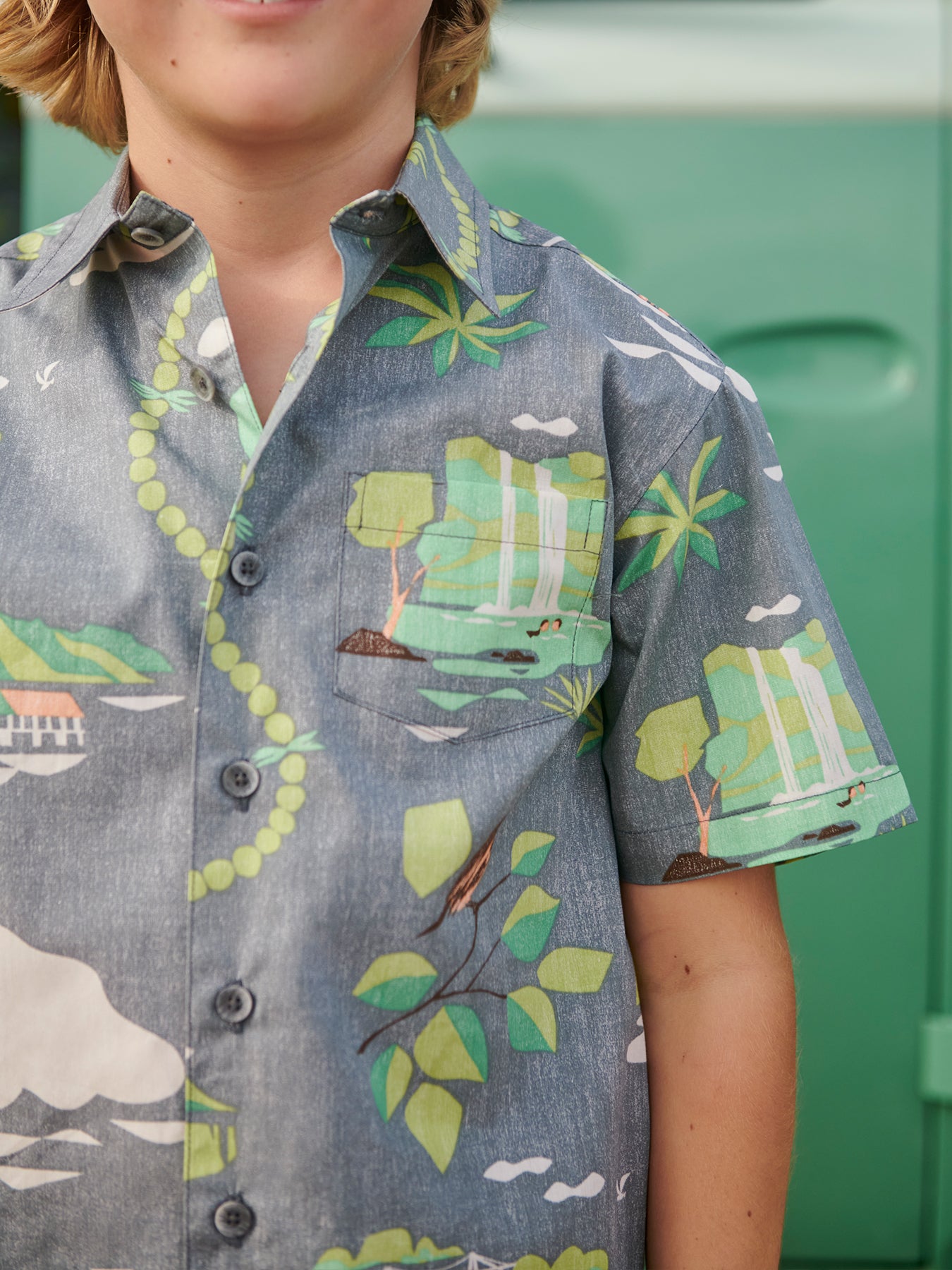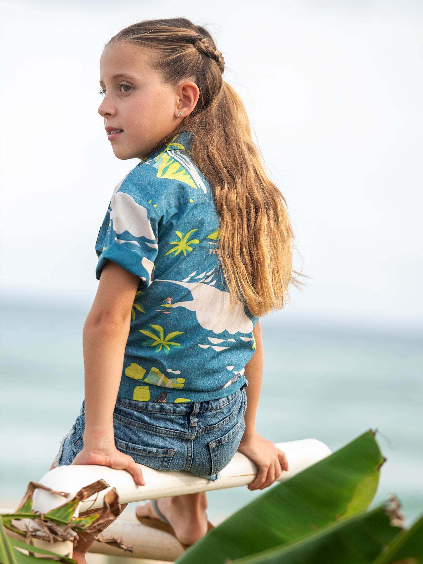 Made from lightweight 100% cotton broadcloth, this matching aloha shirt brings Kuchar’s playful Kaua‘i artwork to the littlest island explorers.