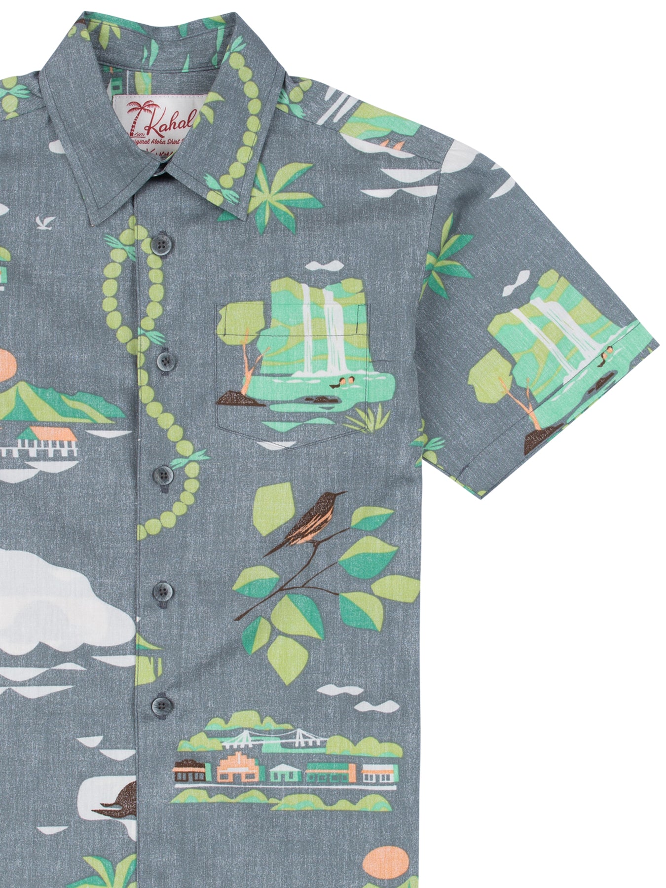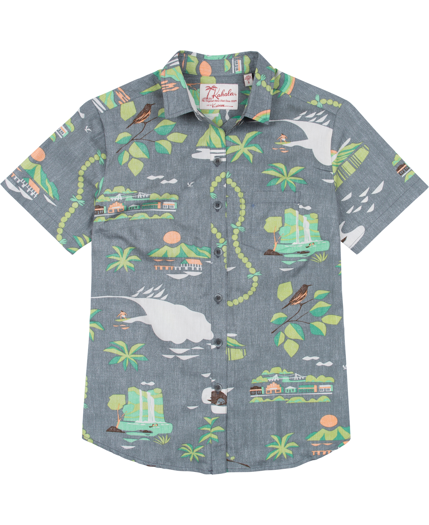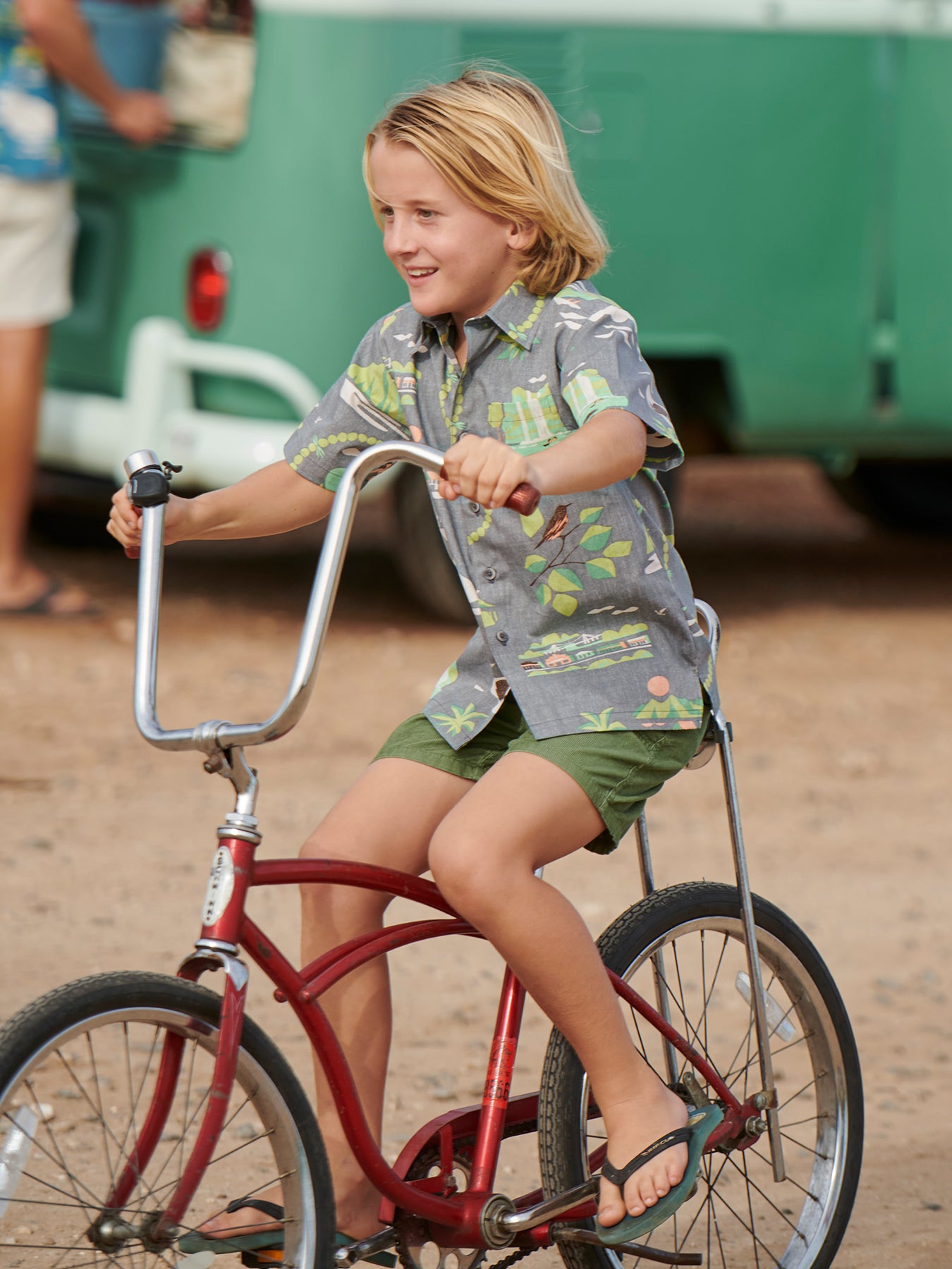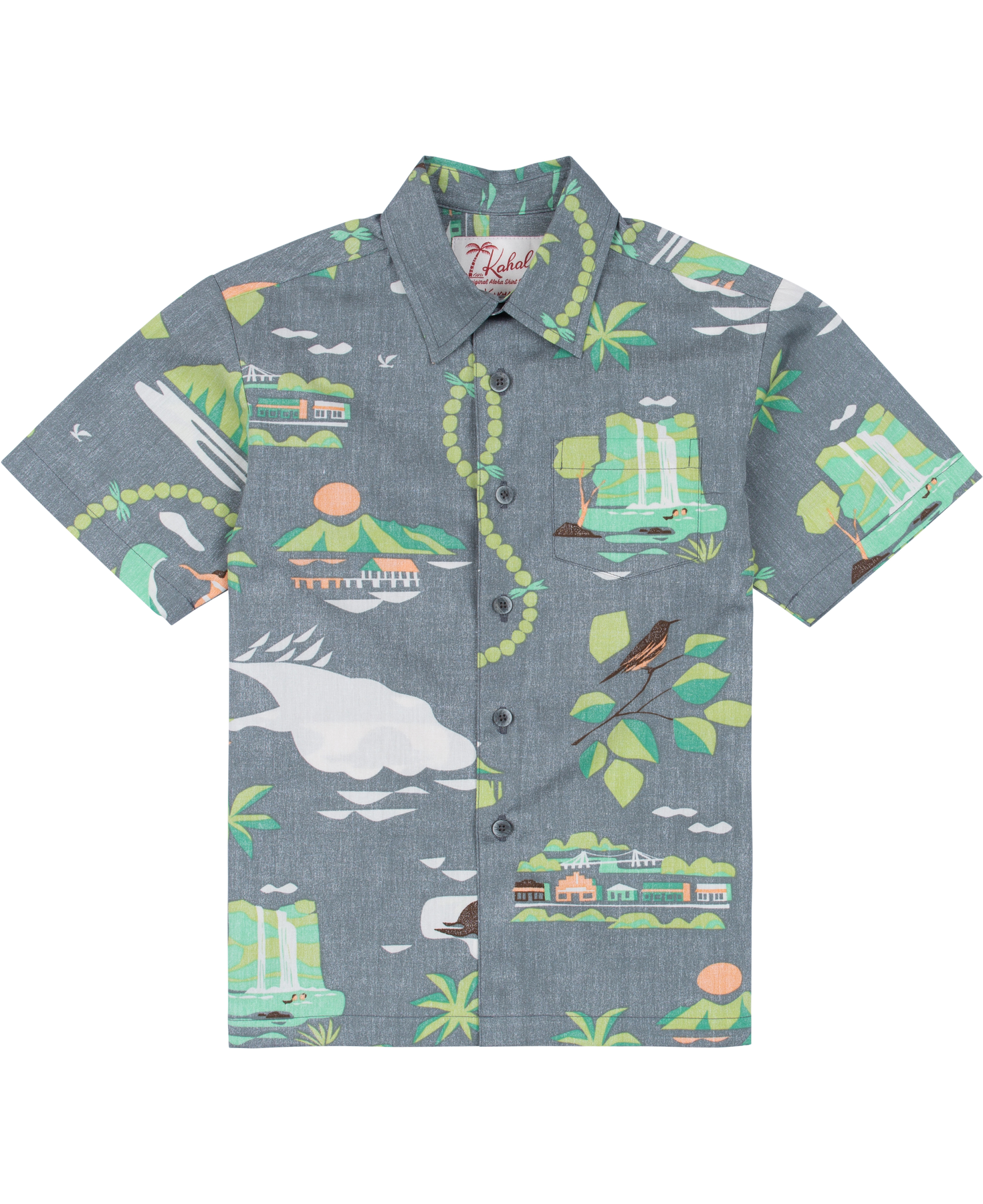 Made from lightweight 100% cotton broadcloth, this matching aloha shirt brings Kuchar’s playful Kaua‘i artwork to the littlest island explorers.