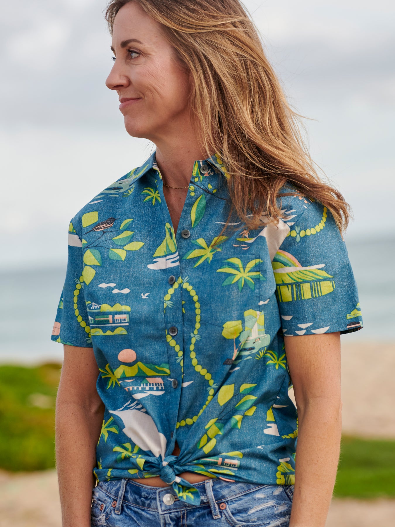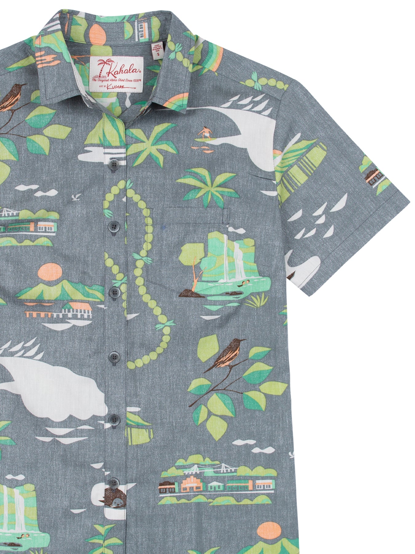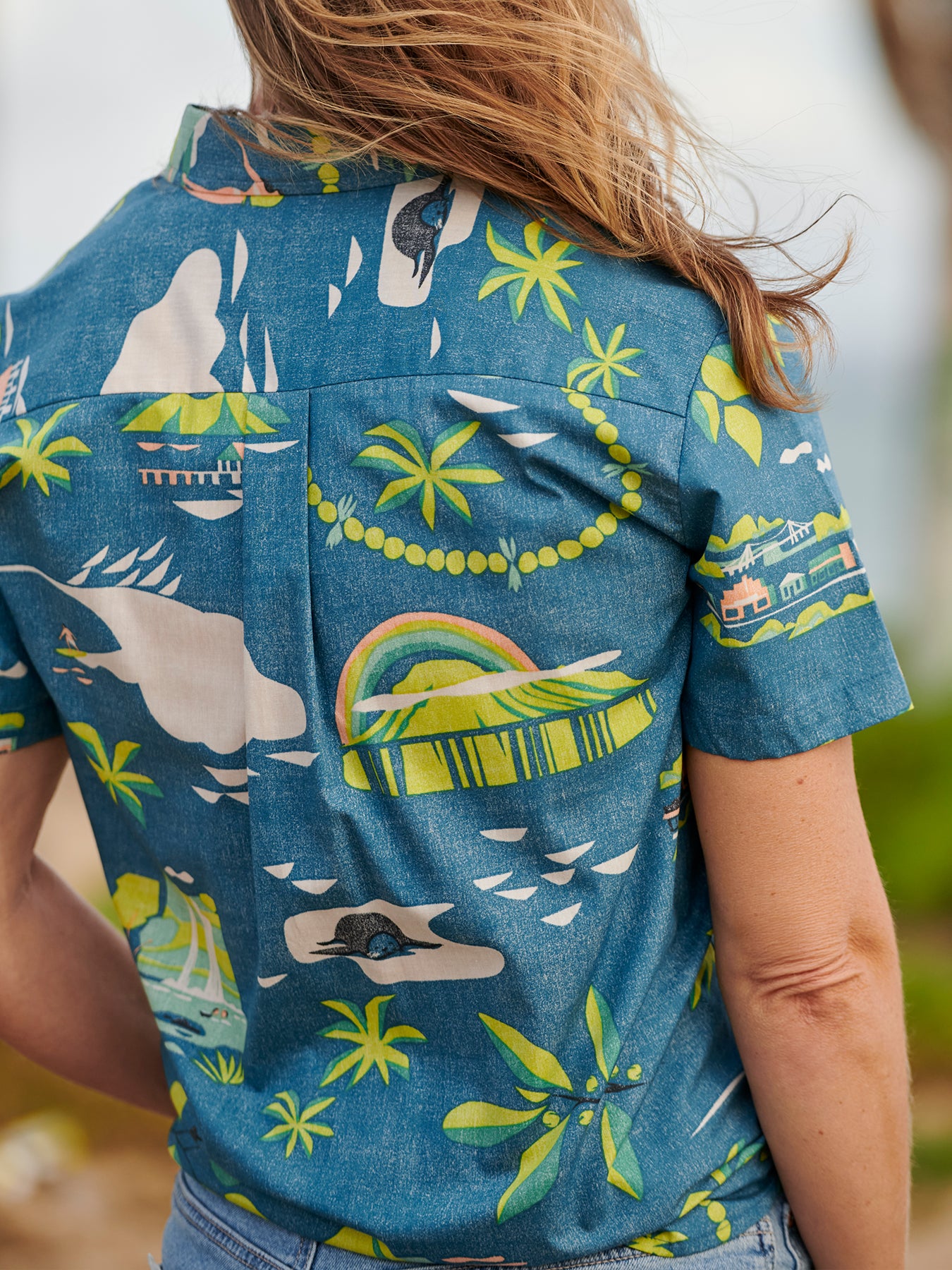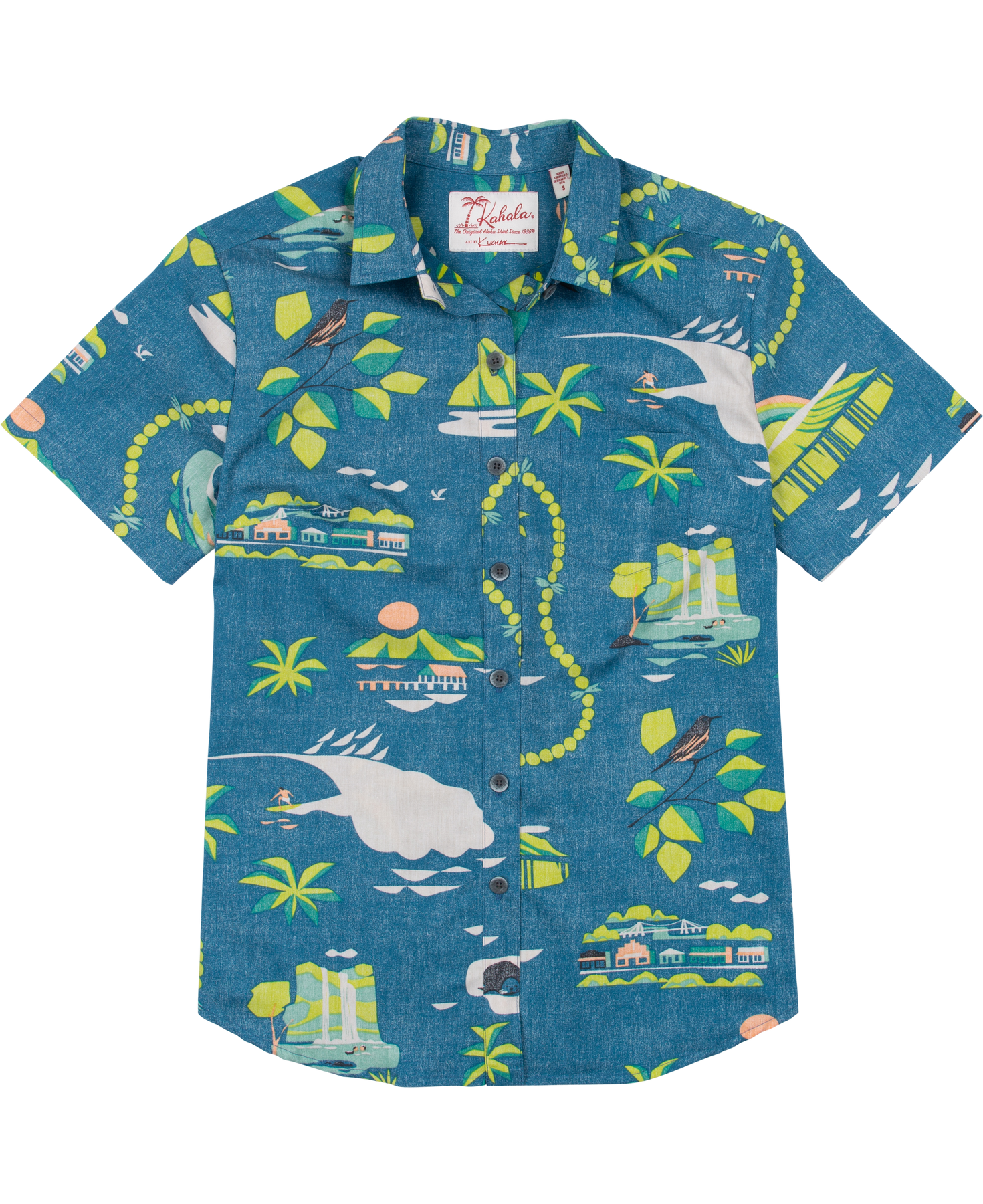 A 100% cotton broadcloth blouse showcasing Kuchar’s nostalgic Kaua‘i print in soft, timeless tones.
