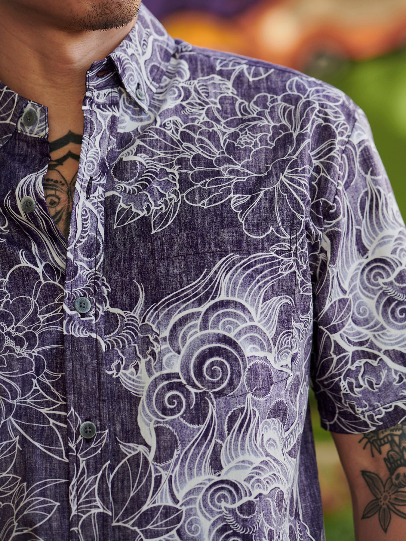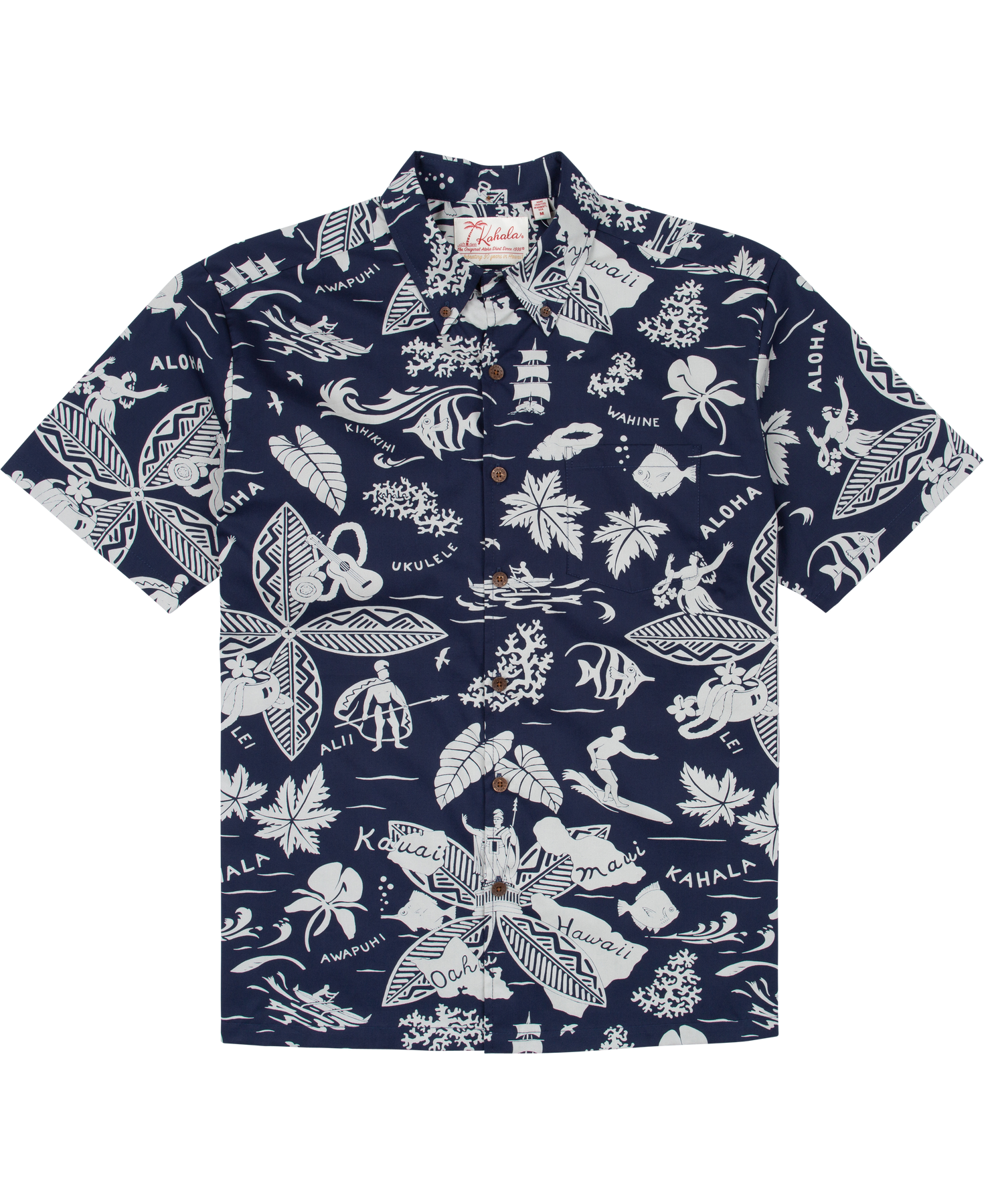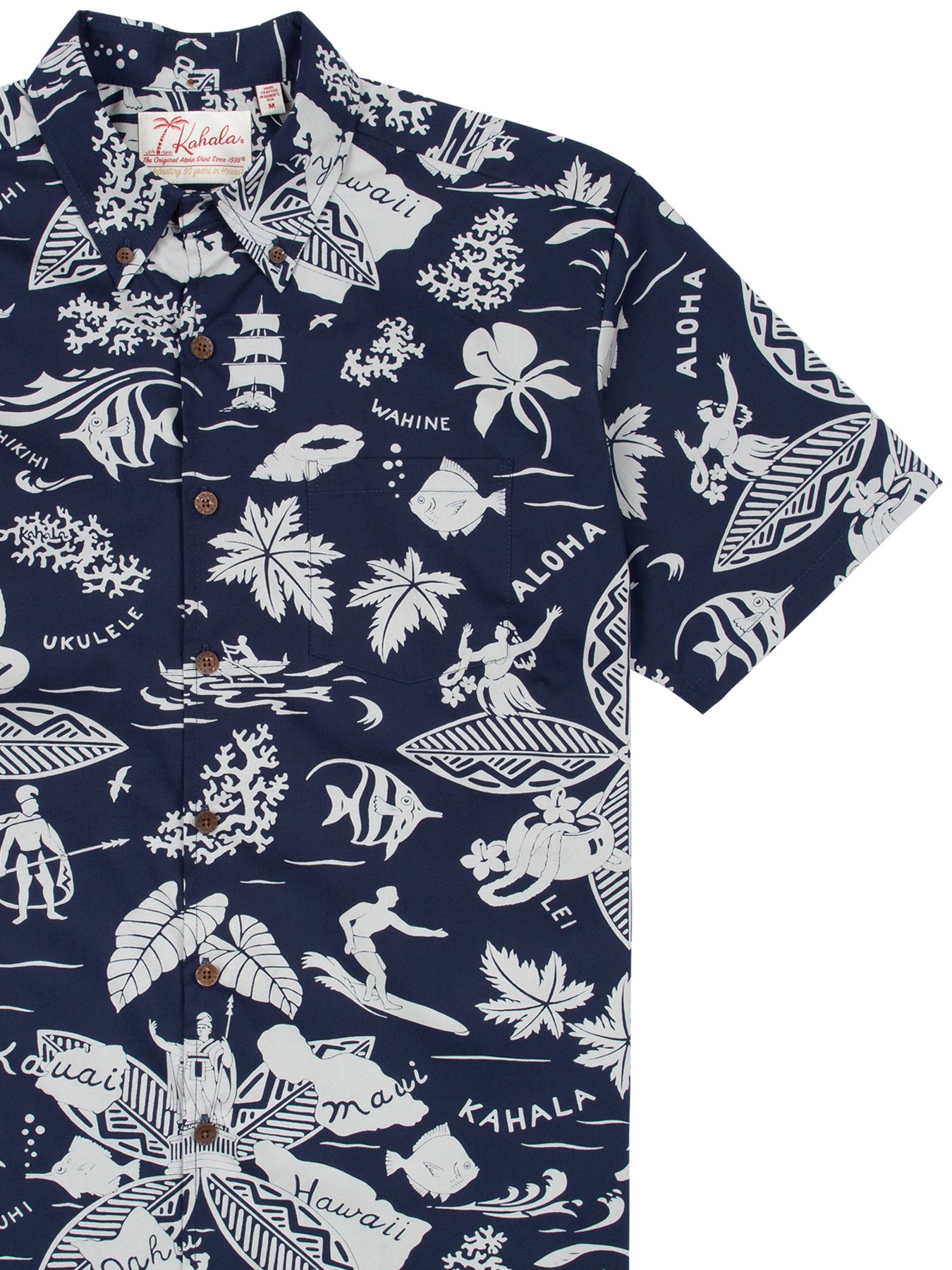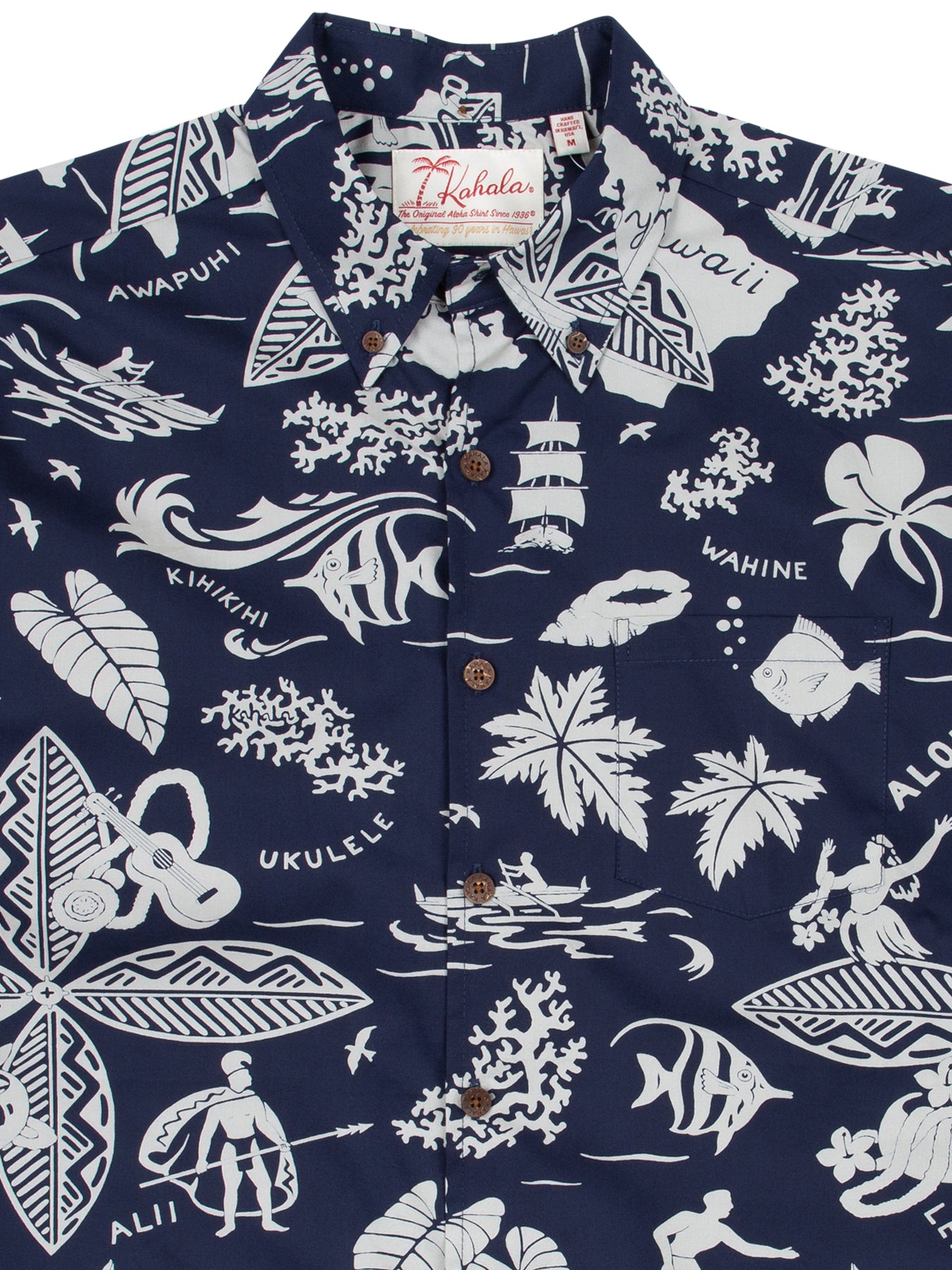 The vintage-inspired button-down collar, French front, and coconut buttons honor traditional aloha shirt silhouettes, while a matched pocket adds a refined touch. The bold, saturated colors are achieved with discharge printing, a technique that extracts dye from the fabric to reveal intricate motifs. Proudly made in Hawai‘i, Duke's Day embodies the Ambassador of Aloha in every stitch.