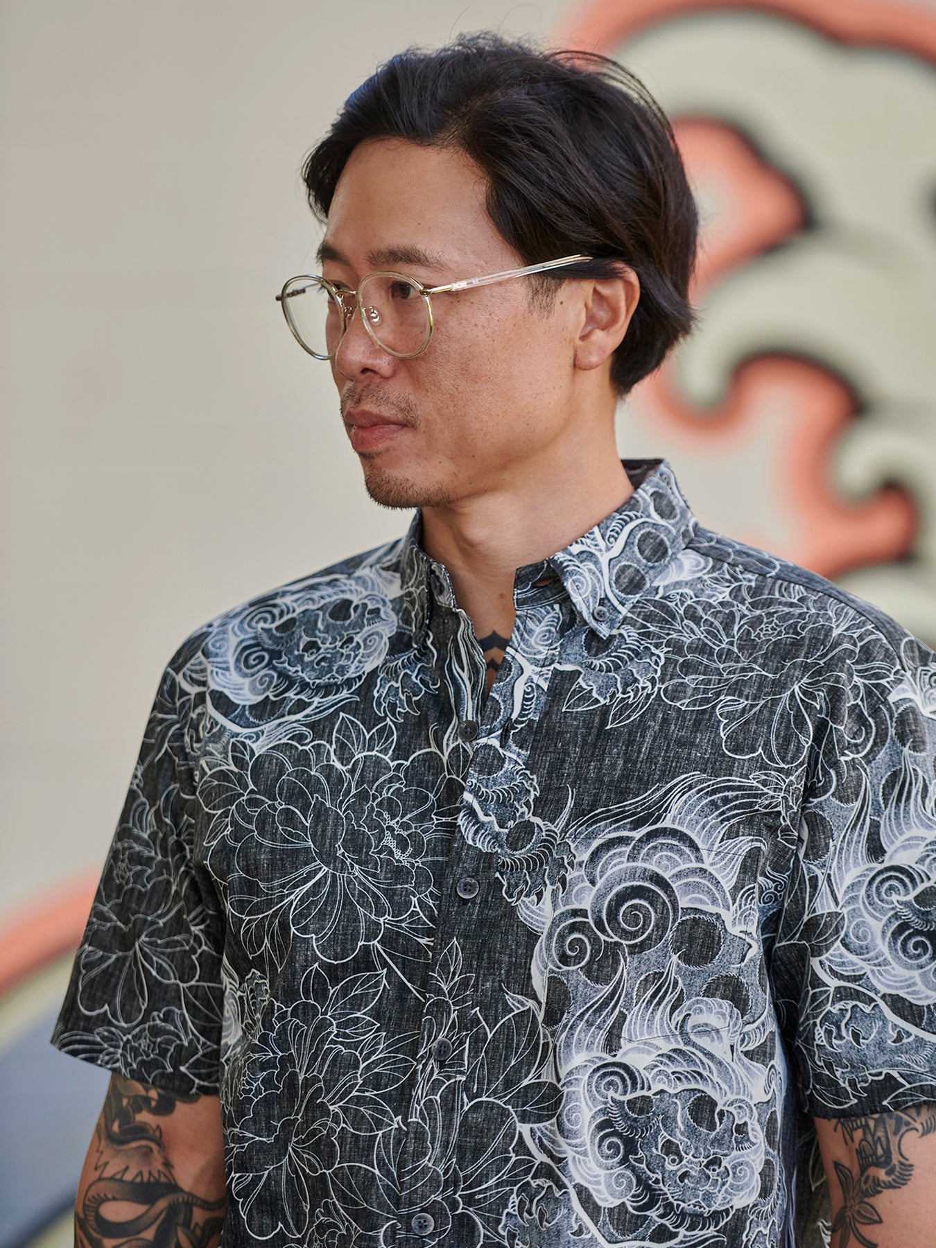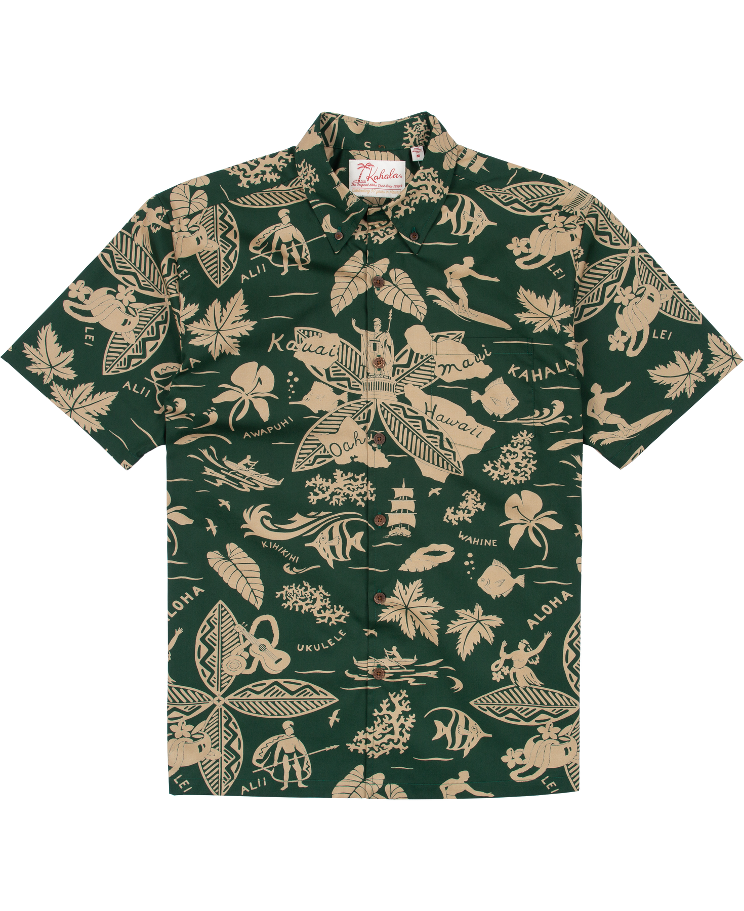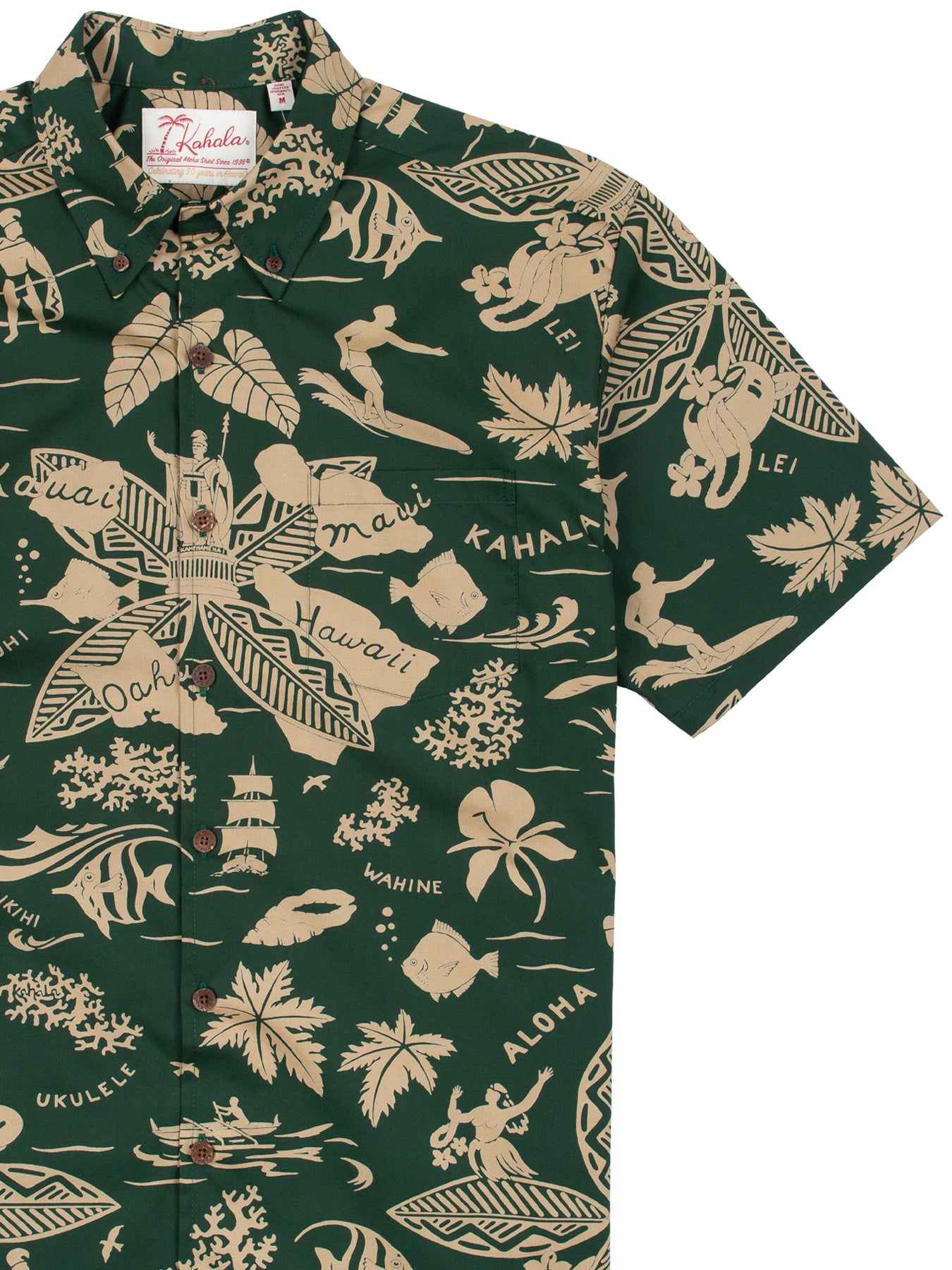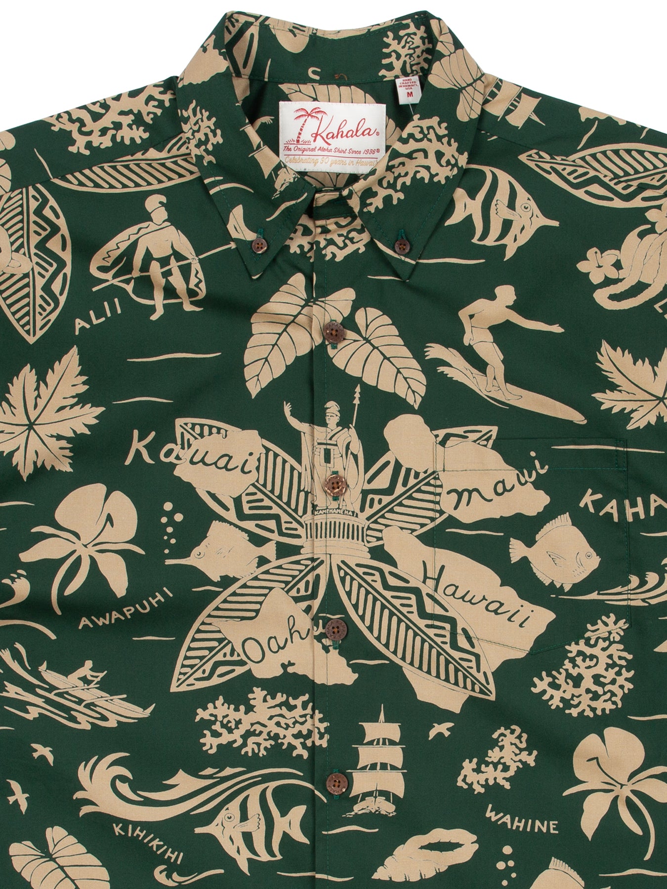 The vintage-inspired button-down collar, French front, and coconut buttons honor traditional aloha shirt silhouettes, while a matched pocket adds a refined touch. The bold, saturated colors are achieved with discharge printing, a technique that extracts dye from the fabric to reveal intricate motifs. Proudly made in Hawai‘i, Duke's Day embodies the Ambassador of Aloha in every stitch.