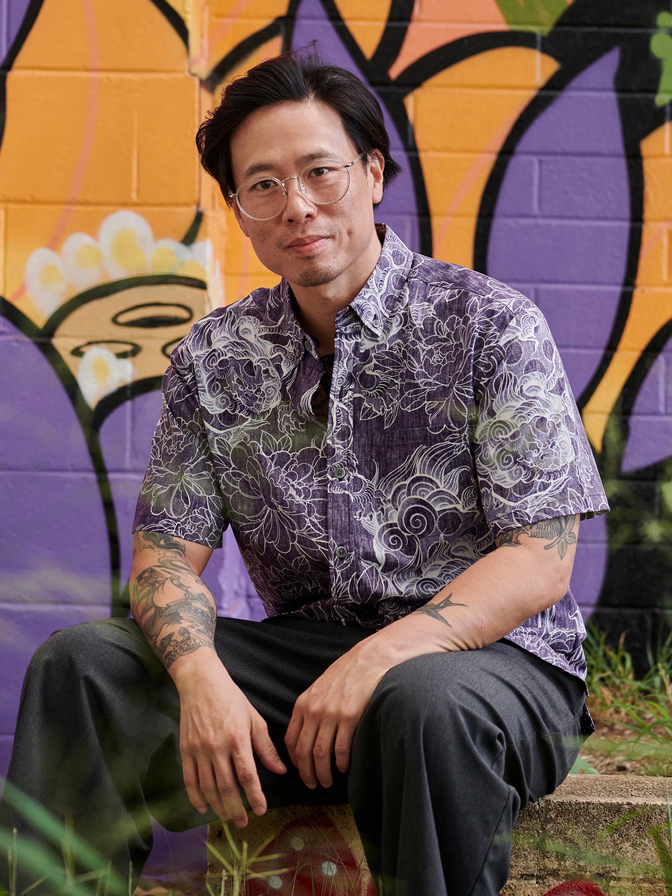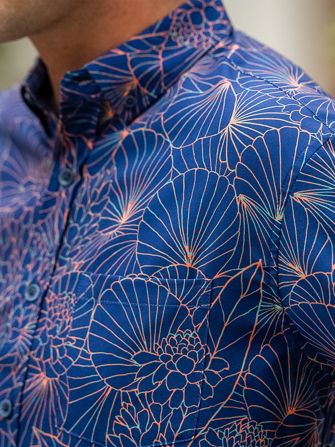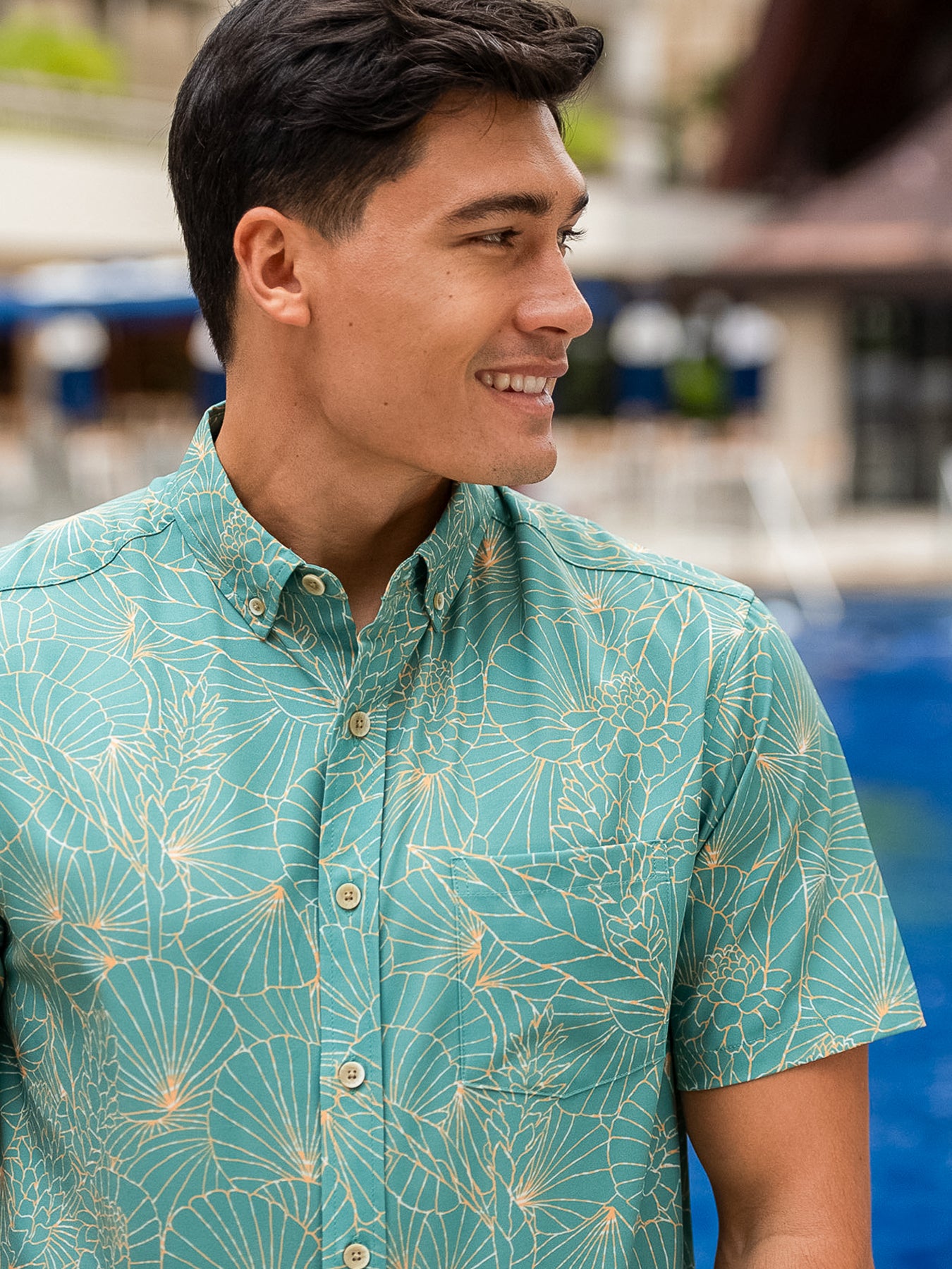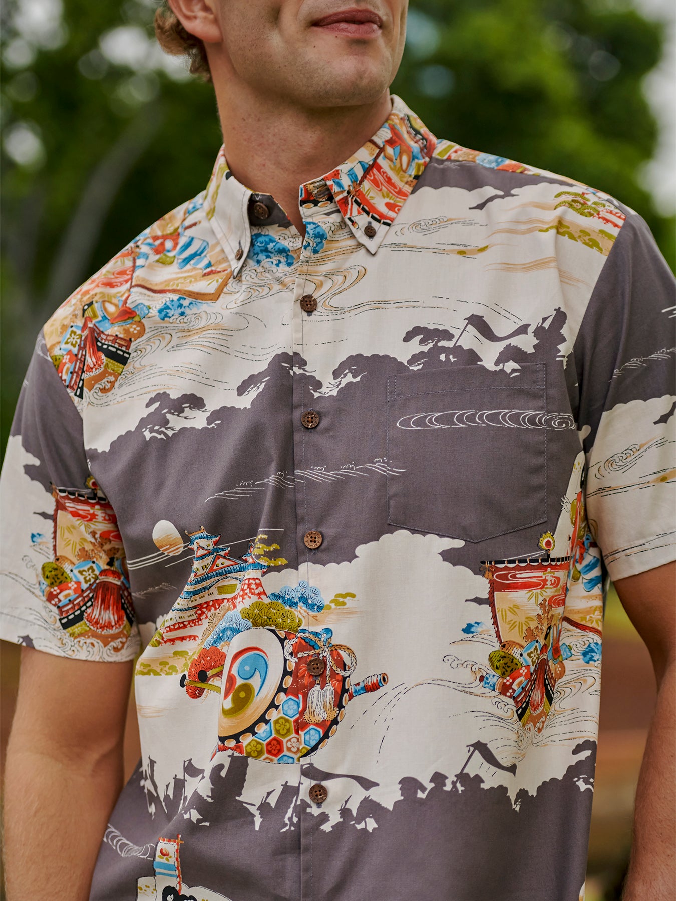 The vintage-inspired button-down collar, French front, and coconut buttons honor traditional aloha shirt silhouettes, while a matched pocket adds a refined touch. The bold, saturated colors are achieved with discharge printing, a technique that extracts dye from the fabric to reveal intricate motifs. Proudly made in Hawai‘i, Duke's Day embodies the Ambassador of Aloha in every stitch.
