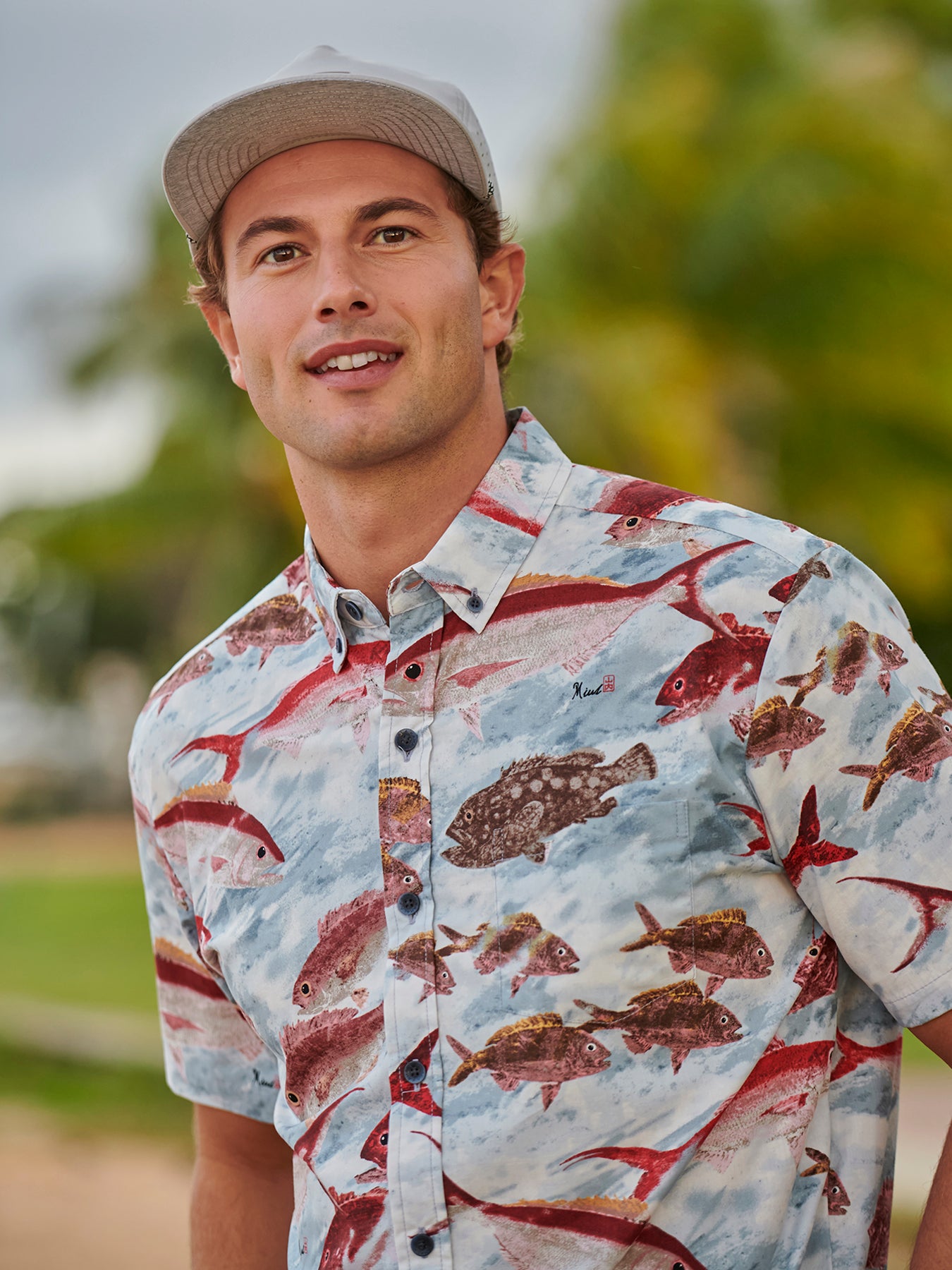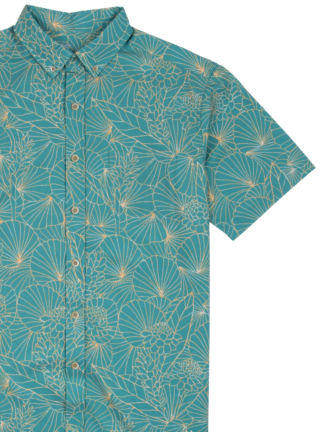 The vintage-inspired button-down collar, French front placket, and coconut buttons pay homage to classic aloha shirt silhouettes, while a matched pocket adds a timeless touch. The bold, saturated colors are achieved through discharge printing—a complex process that extracts dye from the fabric to reveal the design. Proudly made in Hawai‘i, Taiyaki embodies the true Ambassador of Aloha in every stitch.