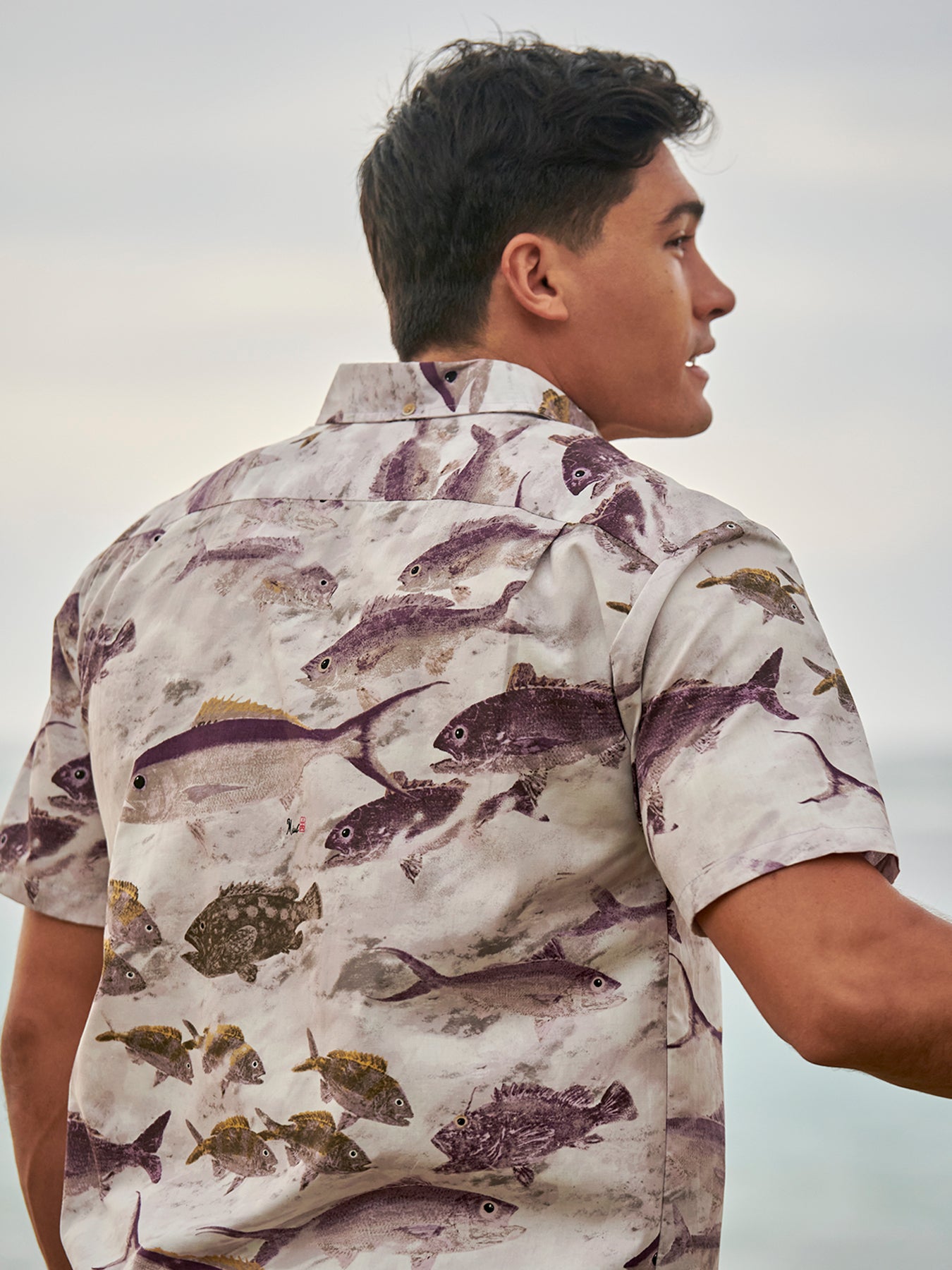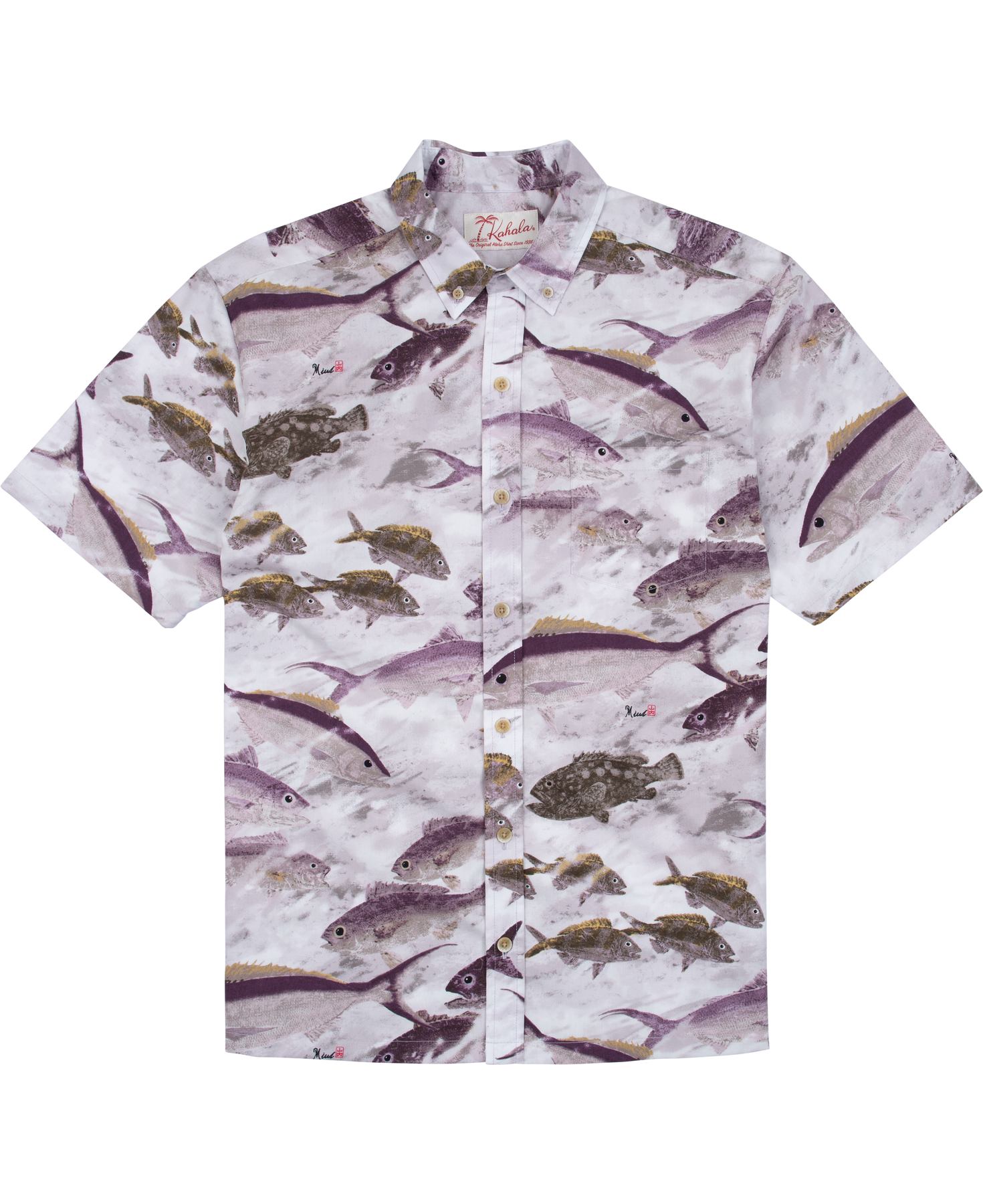 Crafted from Kahala’s signature cotton broadcloth, Taiyaki is a heritage 1950s print from the original Duke Kahanamoku by Kahala. It features a large-scale fish design inspired by traditional Japanese woodblock artwork—drawn with intricate linework, bold vertical lines, and striking color blocking.