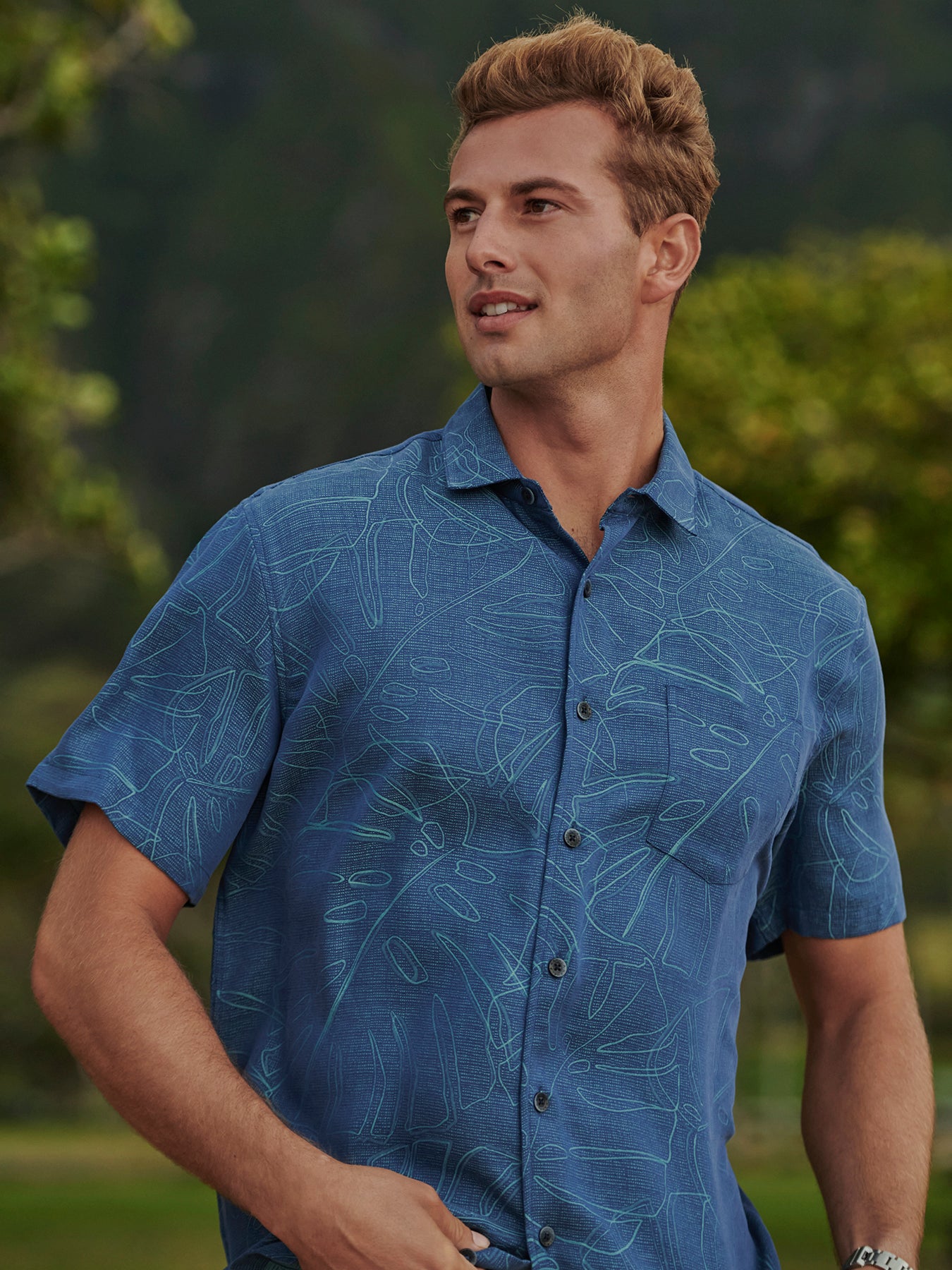 Simple yet impactful, Electric Fern showcases the broad and impressive leaves of the "monstera deliciosa" plant. The simple outlines over a contrasting background are directly woven into the fabric giving the shirt a subtle luster. Get transported to your jungle paradise in this soft polynosic style perfect for any occasion.