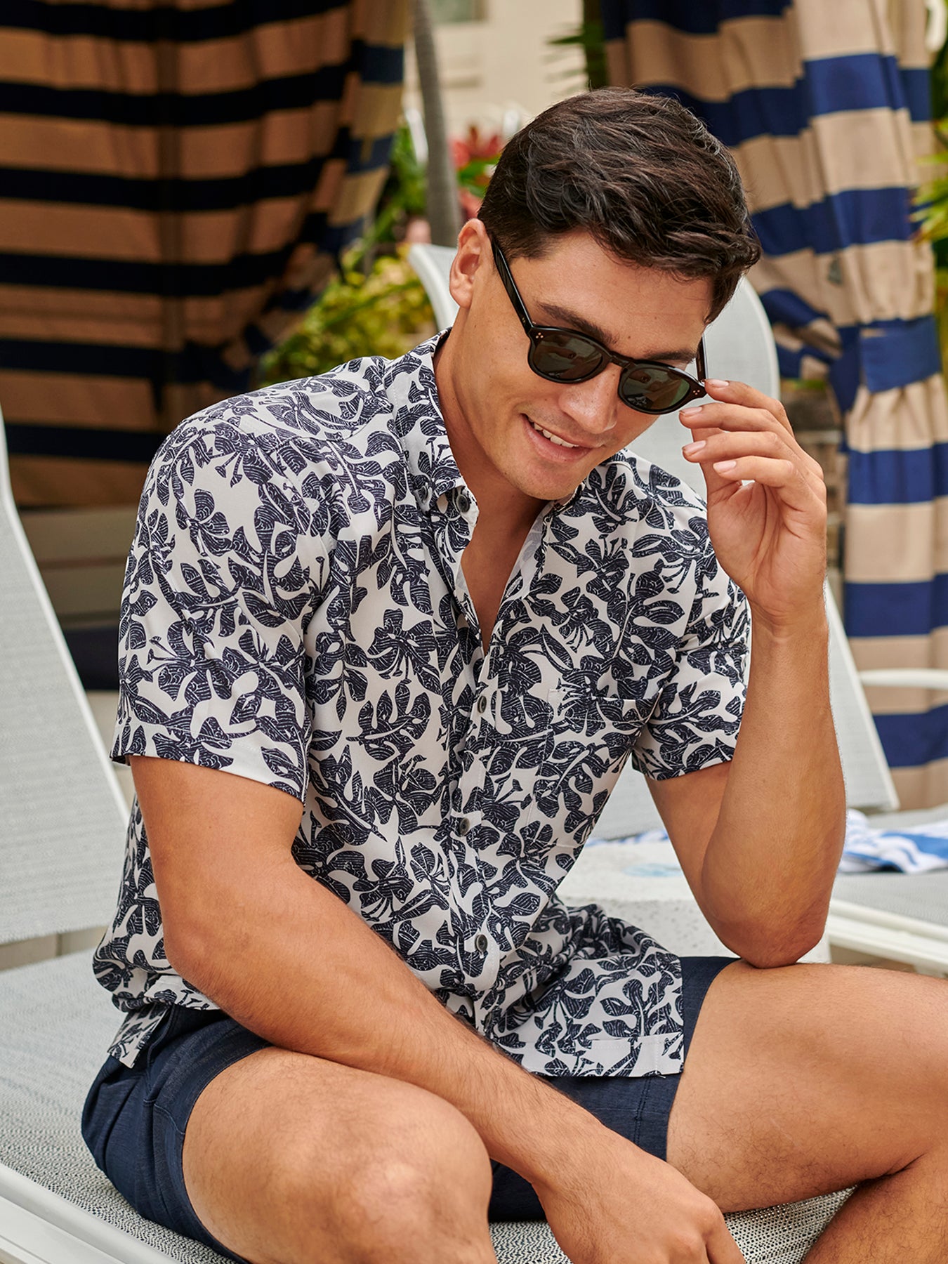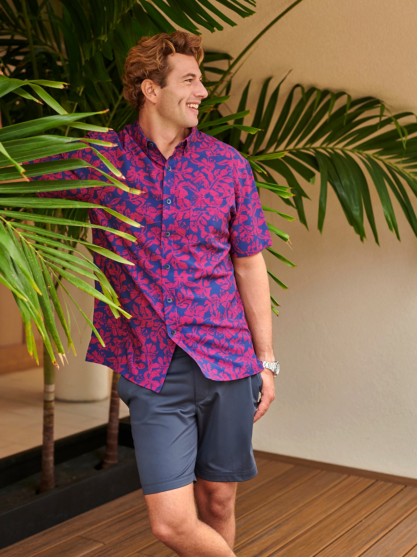 Crafted in a recycled polyester stretch fabric, this performance aloha shirt is lightweight, breathable, and designed to move with you. Enhanced stretch and moisture-wicking properties help keep you comfortable in warm conditions, while quick-dry performance and 40 sun protection make it well suited for long days outdoors. Offered in Light Grey and Navy.